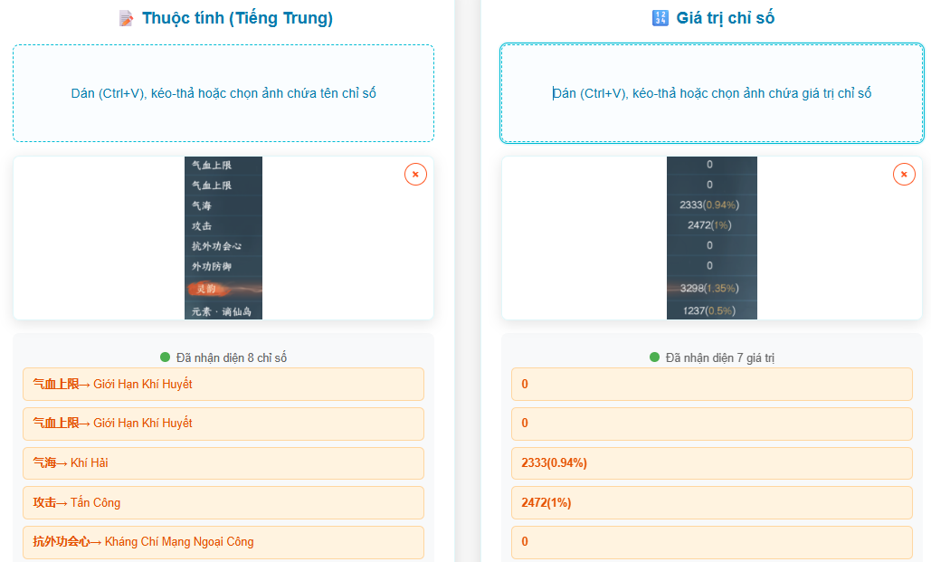 Tải lên 2 ảnh riêng biệt: một ảnh chứa thuộc tính tiếng Trung và một ảnh chứa giá trị chỉ số.